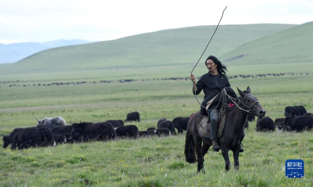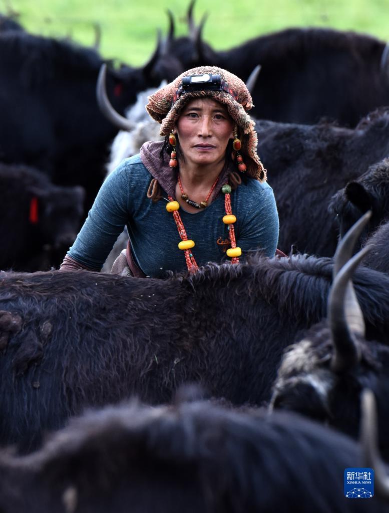7月13日,羅日卓瑪在牦牛群中勞作。新華社記者 陳?ài)?攝