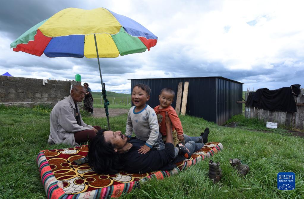 7月13日,巴周和兩個(gè)外孫在遠(yuǎn)牧點(diǎn)玩耍。新華社記者 陳?ài)?攝