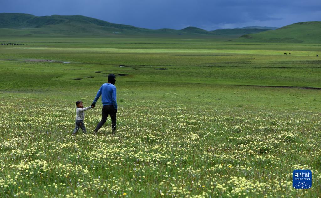 7月13日,巴周的女婿扎西拉著兒子走在家里的草場(chǎng)上。新華社記者 陳?ài)?攝