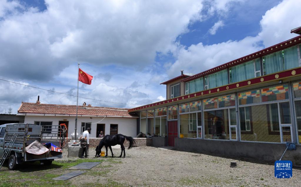 7月15日,巴周的女婿扎西在定居點(diǎn)家里給馬喂水。畫(huà)面中的兩層小樓是三年前新建的。新華社記者 陳?ài)?攝