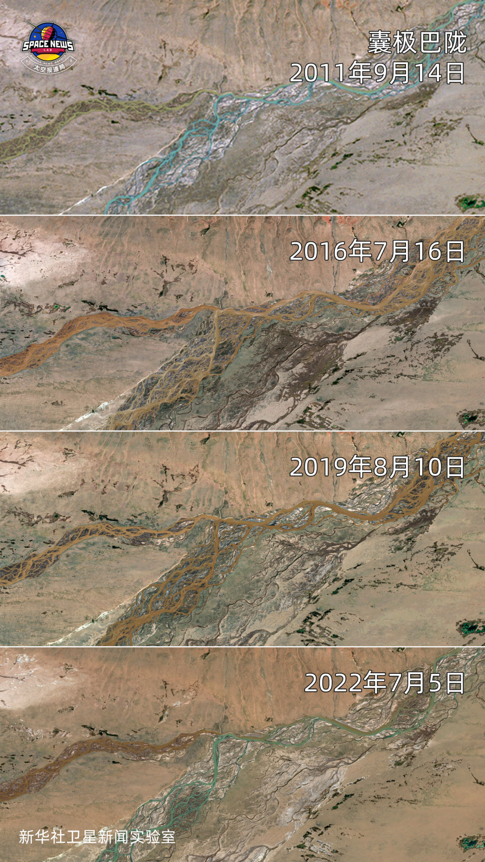 在長(zhǎng)江正源沱沱河和南源當(dāng)曲匯合的囊極巴隴,不同時(shí)期的衛(wèi)星圖像清晰顯示,江源水系河道沖淤頻繁,水流不斷分汊又匯集,鳥(niǎo)瞰就像在大地上扎起許多小辮子。