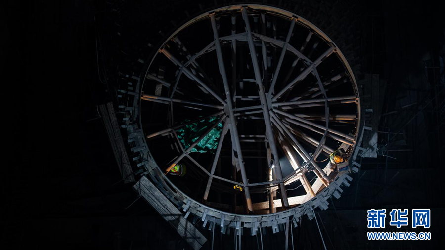 瑪爾擋公司工作人員在水電站地下廠房建設(shè)現(xiàn)場查看工程進度。新華網(wǎng) 潘彬彬 攝