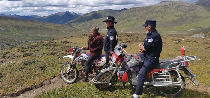 禾尼鄉(xiāng)派出所接到求助后,立即安排在附近開展工作的草原騎警隊警力寧紅玉、澤仁公布、格絨降措帶領熟悉附近地形的派出所群防群治義警隊員丁真稱乃,騎摩托車趕赴現(xiàn)場。期間,草原騎警隊協(xié)調附近牧民租借3臺摩托車前往迷路地方尋找,因迷路地點在海拔4800多米的高山,草原騎警隊翻山越嶺,經過3個多小時的尋找,與迷路人員家屬在一山坳處找到德洛。家屬滿含熱淚的看著草原騎警隊隊員說,“麻煩你們了,謝謝你們了,你們辛苦了?!?/p>