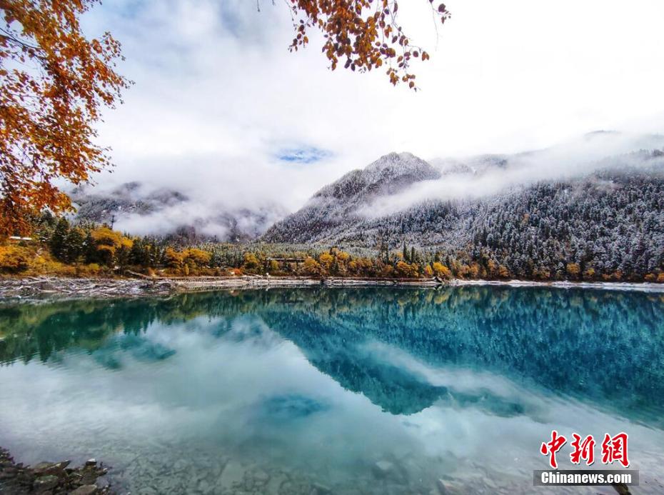 十月,九寨溝長海、原始森林等景點迎來入秋后的第一場雪。澄凈碧藍的海子和金色的彩林與潔白的雪花相映相襯,構成一幅靜謐的美麗畫卷。遠遠看去,成片的彩林被一朵朵雪花點綴,美得像童話世界一般。 梁峰 攝