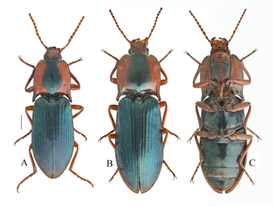 2022年6月17日,綿陽師范學(xué)院團隊來到四川省阿壩藏族羌族自治州黑水縣,開展草原有害生物普查工作。當(dāng)天下午6點過,他們到達了黑水縣,在蘆花鎮(zhèn)四美村的一條土路旁,一只長相新奇的甲蟲引起了許浩的注意。“他發(fā)現(xiàn)后趕緊叫住我,甲蟲呈現(xiàn)金屬藍(lán)色光澤,在其前胸背板的兩側(cè),都有紅色斑紋,長得特別好看。”邱鷺說,“當(dāng)時初步判斷是一個金叩甲的物種,但以前從來沒見過?!?/p>