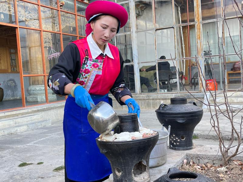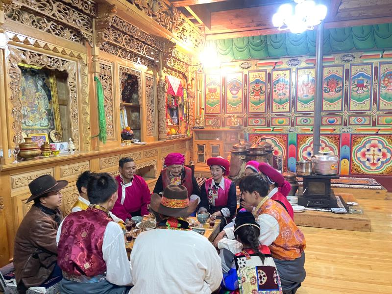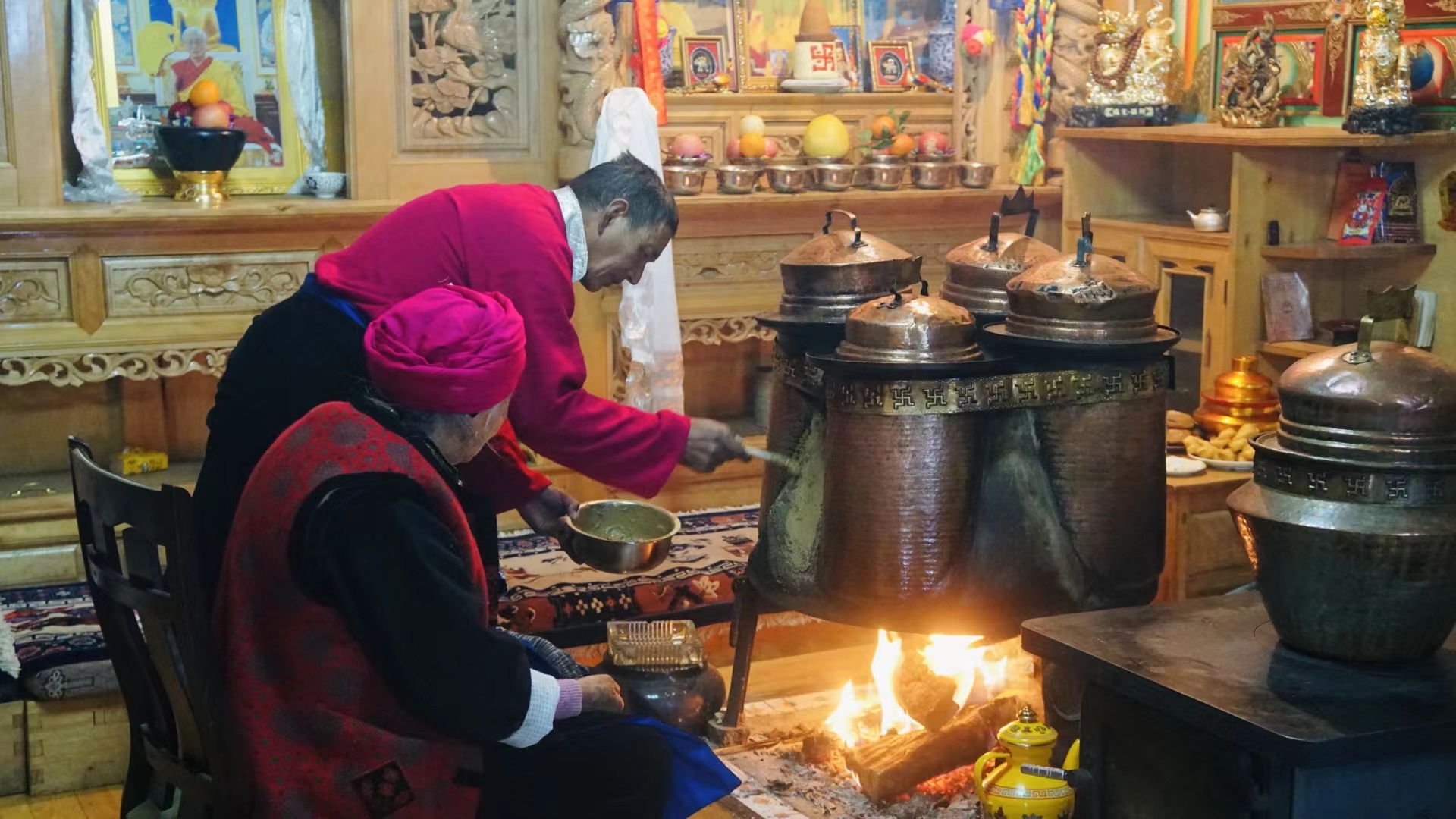 傍晚時分,“年夜飯”準(zhǔn)備完成,初稱站在火塘邊把剛和好的稀泥一層一層地刷到火塘上,“這是藏歷新年的添新土儀式(藏歷新年接福習(xí)俗),表示我們對來年日子風(fēng)調(diào)雨順、紅紅火火的美好期待?!背醴Q把這些傳統(tǒng)習(xí)俗認(rèn)真地教給家里的孩子們。