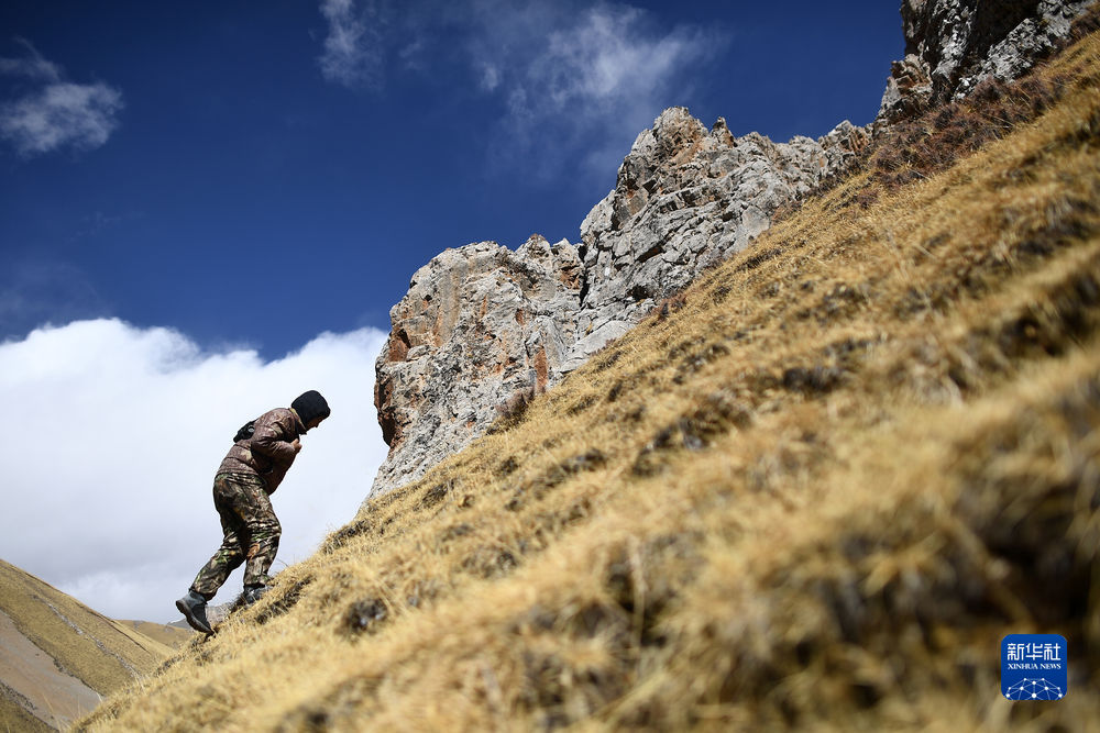 2月21日,更求曲朋在昂賽大峽谷里巡護(hù)時(shí)查看巖羊留下的毛發(fā)。新華社記者 費(fèi)茂華 攝