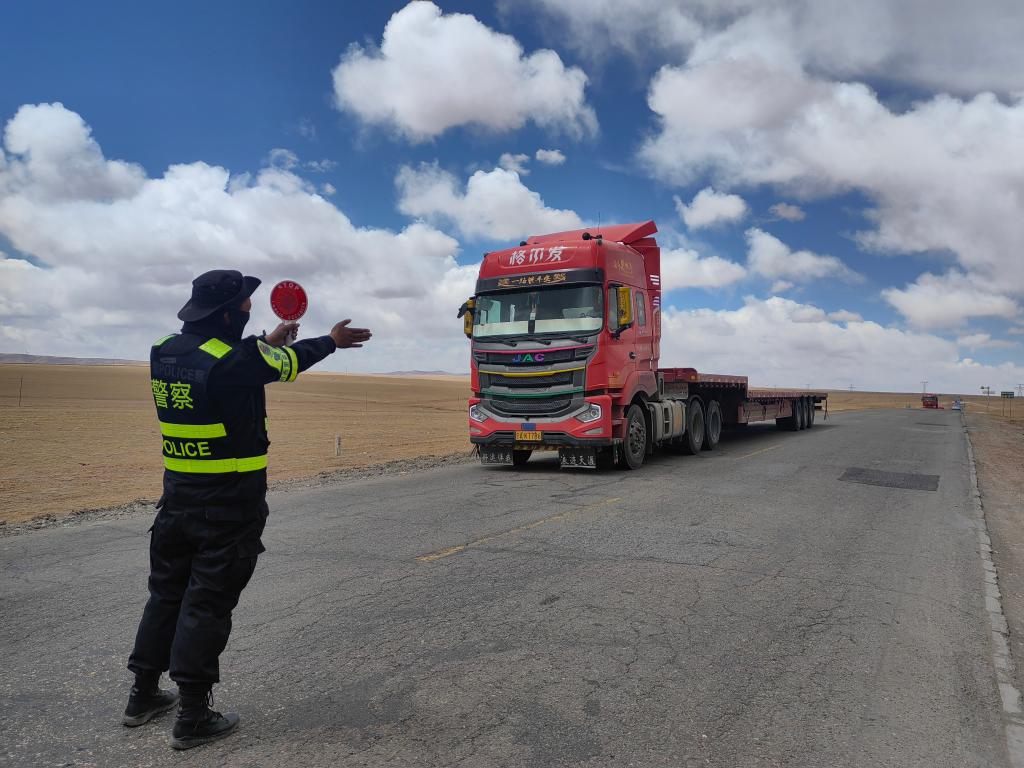 三江源國家公園長江源園區(qū)可可西里管理處保護站工作人員引導車輛避讓遷徙羊群。(三江源國家公園長江源園區(qū)可可西里管理處供圖)