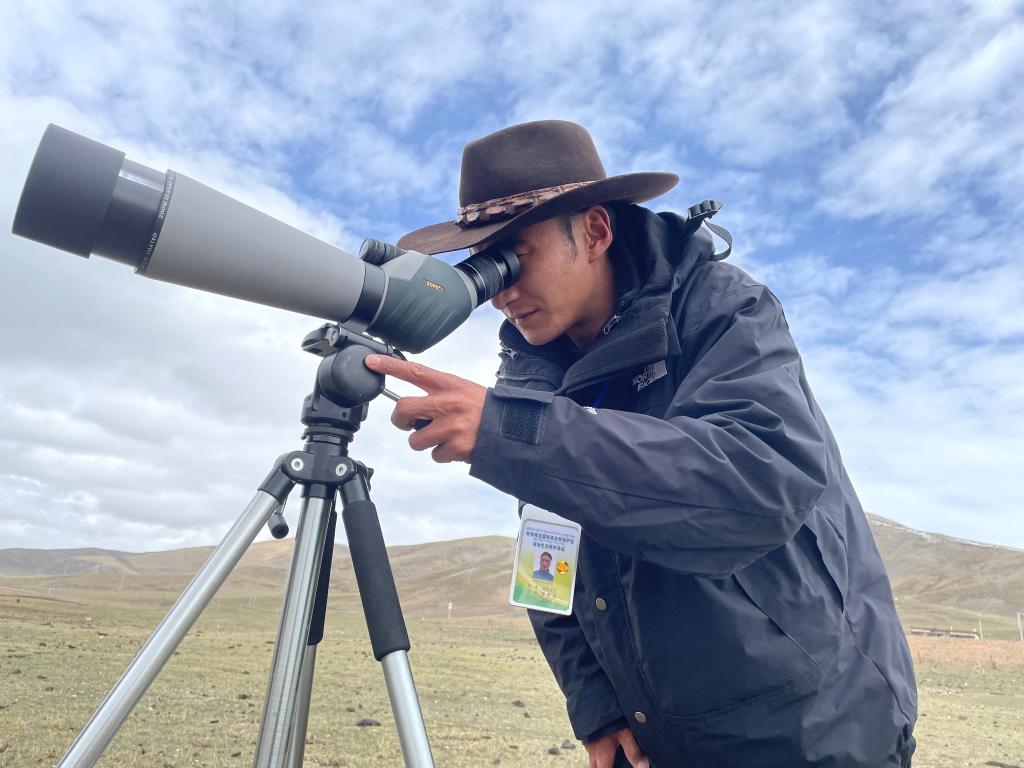 5月21日,昂旺才仁正在用望遠(yuǎn)鏡觀察鳥(niǎo)類活動(dòng)。 新華社記者 李琳海 攝