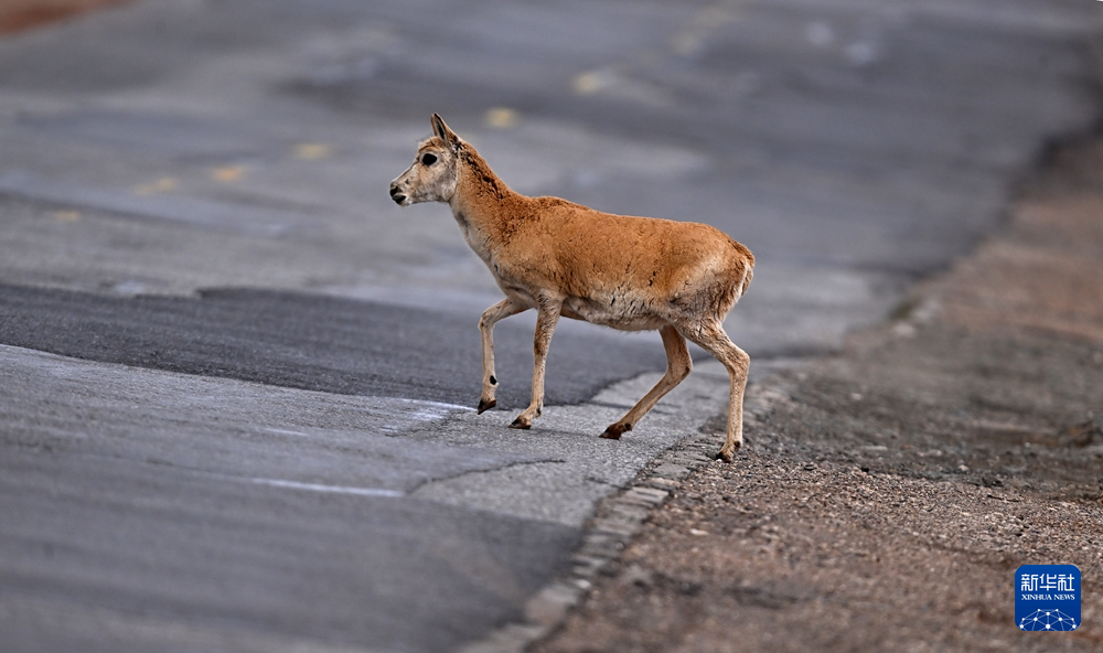 5月28日,在青??煽晌骼?,一只雌性待產(chǎn)藏羚羊通過(guò)青藏公路。新華社記者 張宏祥 攝