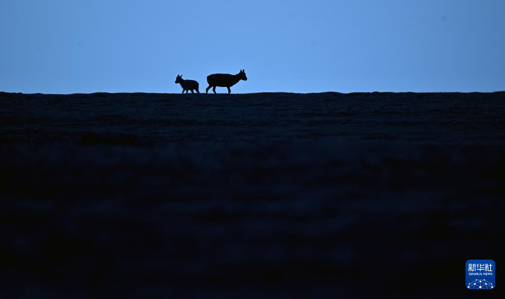 兩只藏羚羊在可可西里卓乃湖區(qū)域活動(6月18日攝)。 新華社記者 張宏祥 攝