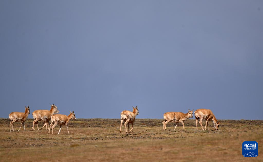 一群藏羚羊在可可西里卓乃湖區(qū)域活動(6月17日攝)。新華社記者 張宏祥 攝