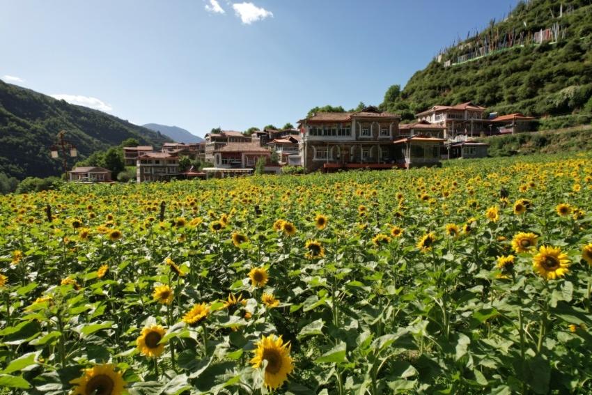 “天蒼蒼,野茫茫,風(fēng)吹草低見牛羊?!标柟饷髅牡南募荆诩t原縣公路兩邊隨處可見悠然吃草的牦牛和藏綿羊,令人心曠神怡。