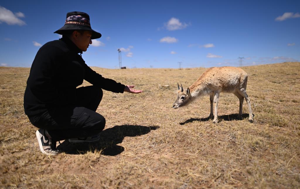 在可可西里國家級自然保護(hù)區(qū)索南達(dá)杰保護(hù)站,巡山隊(duì)員扎西桑周在野生動物救助中心內(nèi)與一只被救助的小藏羚羊互動(5月30日攝)。新華社記者 張宏祥 攝
