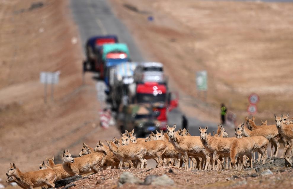 遷徙產(chǎn)仔季,在可可西里五道梁保護(hù)站附近,記者經(jīng)??吹?,成群的雌性藏羚羊,在頭羊帶領(lǐng)下,邁著小碎步,整齊而迅速地穿過青藏公路。往來車輛在工作人員指揮下排起長長的隊(duì)伍,沒有鳴笛、沒有圍觀,只有讓行,一切如此自然。