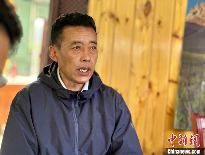 圖為三江源國家公園長(zhǎng)江源園區(qū)曲麻萊管理處生態(tài)環(huán)境和自然資源管理局局長(zhǎng)尕塔正在向記者介紹拉覺悟生態(tài)教育站建設(shè)情況。劉洋 攝
