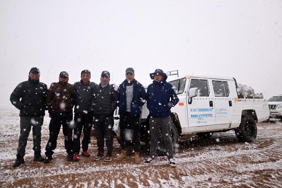 可可西里管理處卓乃湖保護站隊員在前往卓乃湖保護站途中遭遇大雪(6月16日攝)。新華社記者 張宏祥 攝