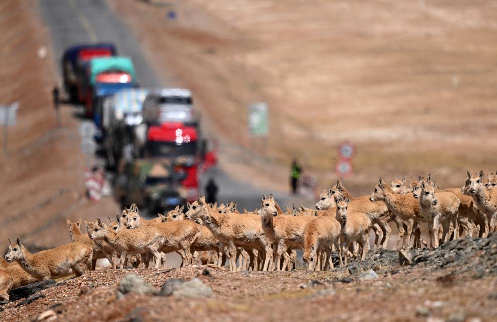 一群待產(chǎn)雌性藏羚羊正在通過青藏公路前往可可西里卓乃湖產(chǎn)仔(5月29日攝)。新華社記者 張宏祥 攝