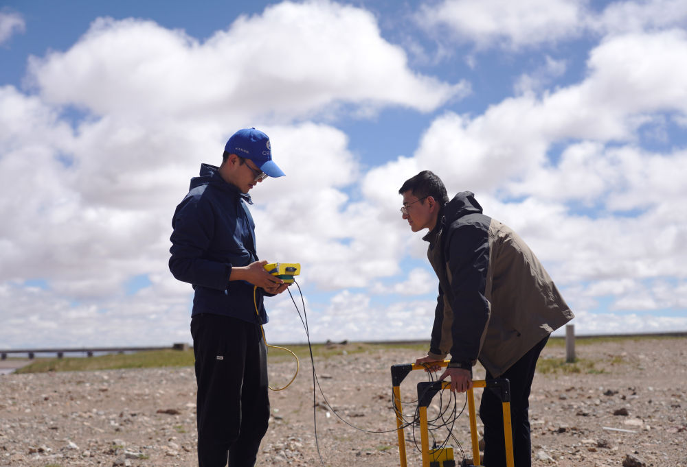科考隊員董士琦(左)和范越在長江北源楚瑪爾河附近進(jìn)行地質(zhì)雷達(dá)探測(7月29日攝)。新華社記者 陳杰 攝