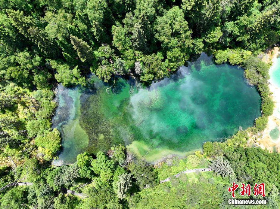 宛如翡翠鑲嵌于山林間 四川九寨溝縣神仙池風(fēng)景如畫