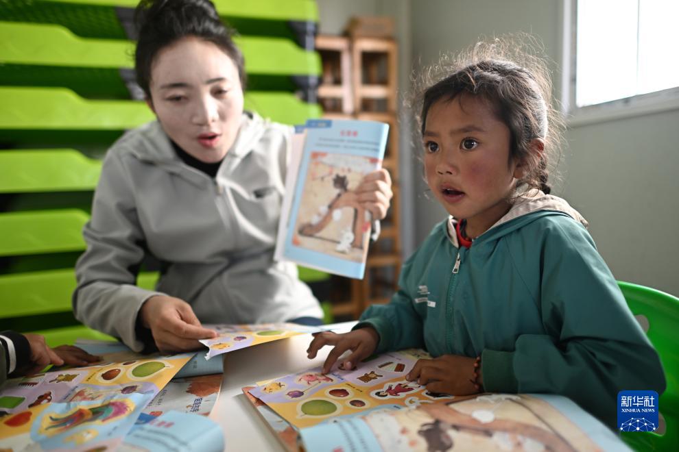在青海省玉樹藏族自治州曲麻萊縣秋智鄉(xiāng)布甫村陽光幼兒園,索南卓瑪(右)在課堂上(9月14日攝)。新華社記者 張宏祥 攝