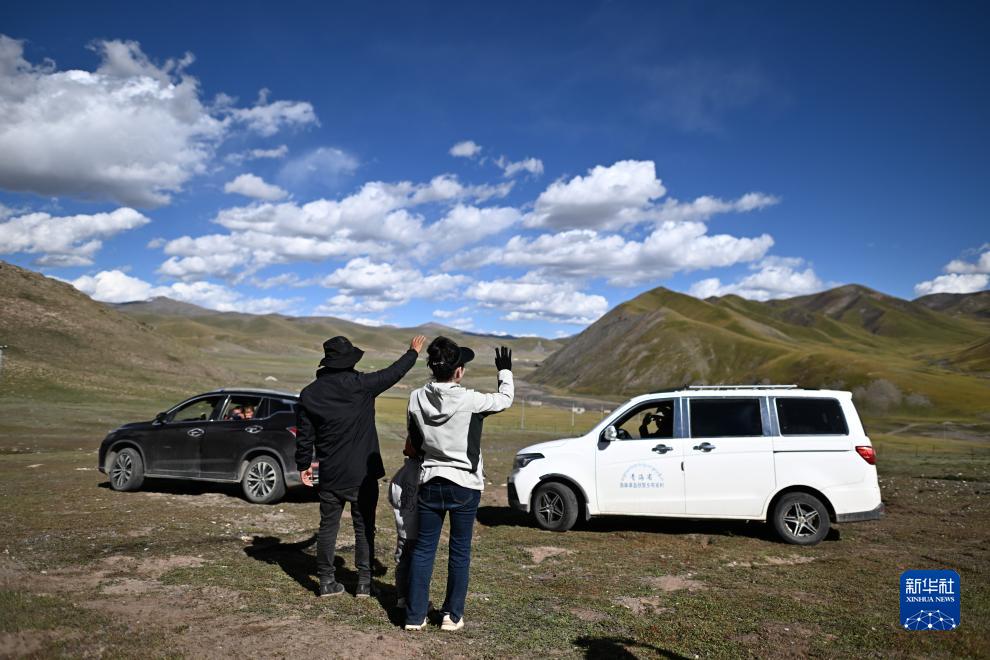 在青海省玉樹藏族自治州曲麻萊縣秋智鄉(xiāng)布甫村陽光幼兒園,老師與學(xué)生家長告別(9月14日攝)。新華社記者 張宏祥 攝