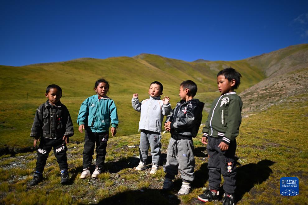 在青海省玉樹藏族自治州曲麻萊縣秋智鄉(xiāng)布甫村陽光幼兒園,歐周挪吾(左三)和伙伴們在教室外的草原上唱歌(9月14日攝)。新華社記者 張宏祥 攝