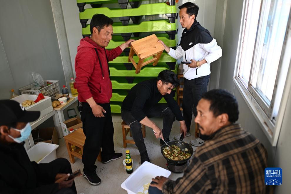 在青海省玉樹藏族自治州曲麻萊縣秋智鄉(xiāng)布甫村陽光幼兒園,秋智鄉(xiāng)幼兒園副園長才仁戰(zhàn)斗(左三)在板房內(nèi)為孩子們準(zhǔn)備午餐(9月14日攝)。新華社記者 張宏祥 攝