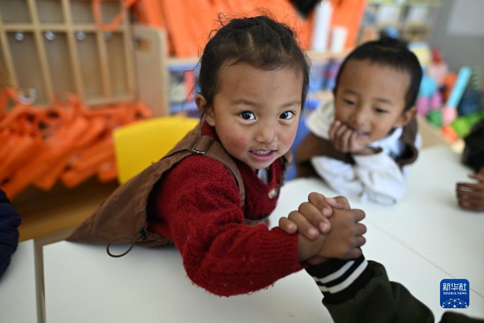 在青海省玉樹藏族自治州曲麻萊縣秋智鄉(xiāng)布甫村陽光幼兒園,丁增巴桑(左)和伙伴們在教室內(nèi)玩耍(9月14日攝)。新華社記者 張宏祥 攝