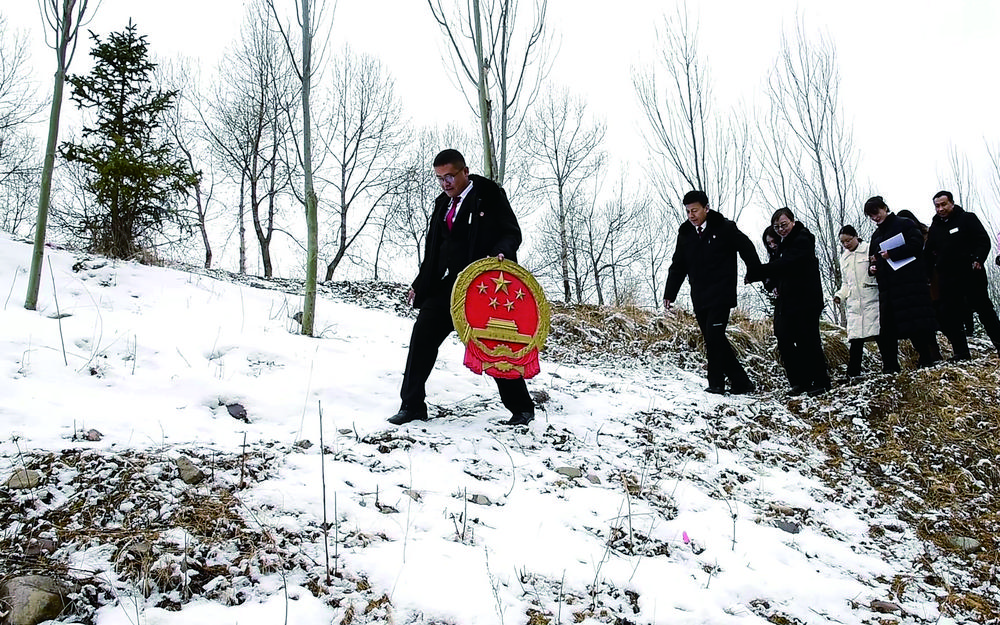 互助土族自治縣人民法院家事審判團(tuán)隊(duì)法官迎著漫天的飛雪,手捧國(guó)徽,入村開展巡回審判。省高級(jí)人民法院供圖