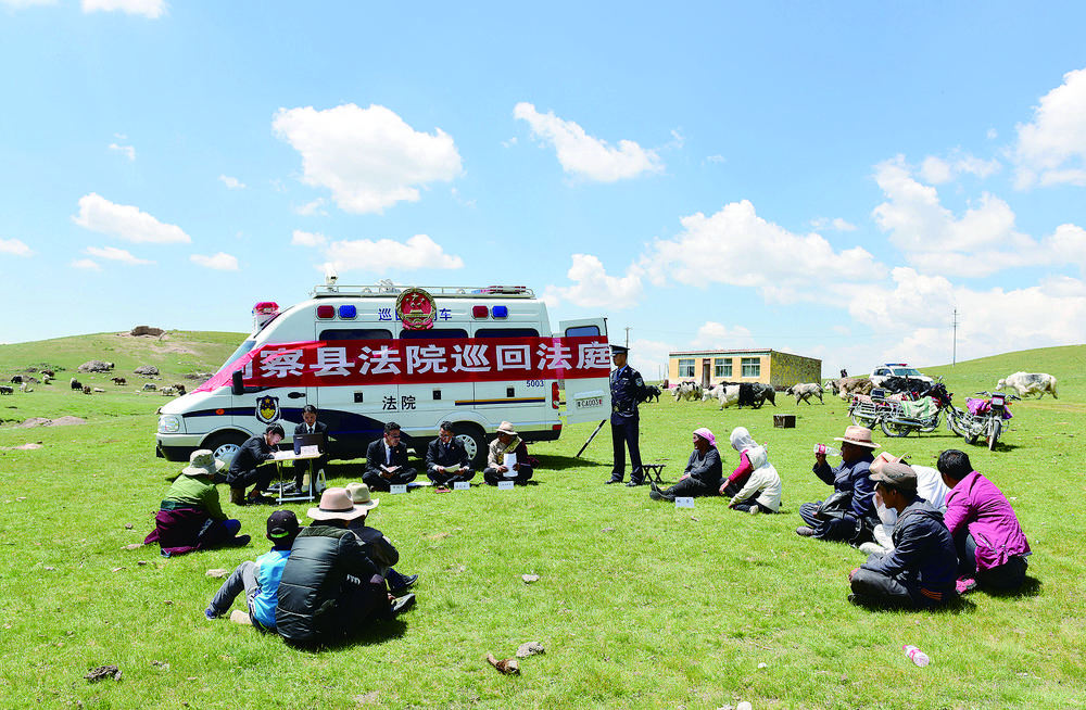 剛察縣人民法院利用巡回審判車,就地開庭審理草場(chǎng)糾紛。省高級(jí)人民法院供圖