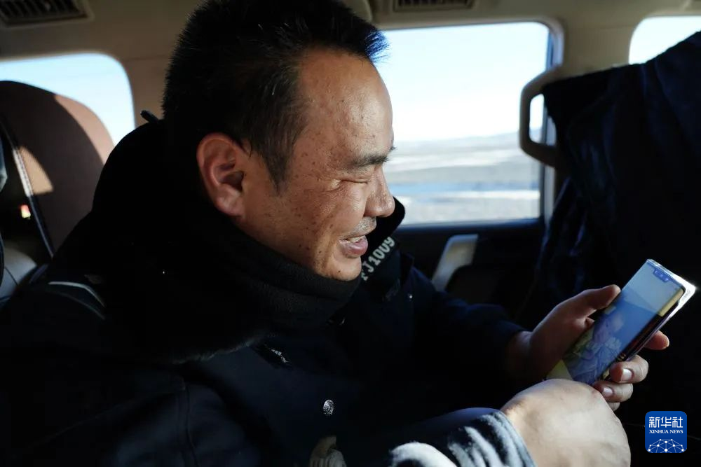 1月19日,巡山隊(duì)員袁廣明在可可西里巡山途中,翻看自己孩子的照片。新華社記者 周盛盛 攝