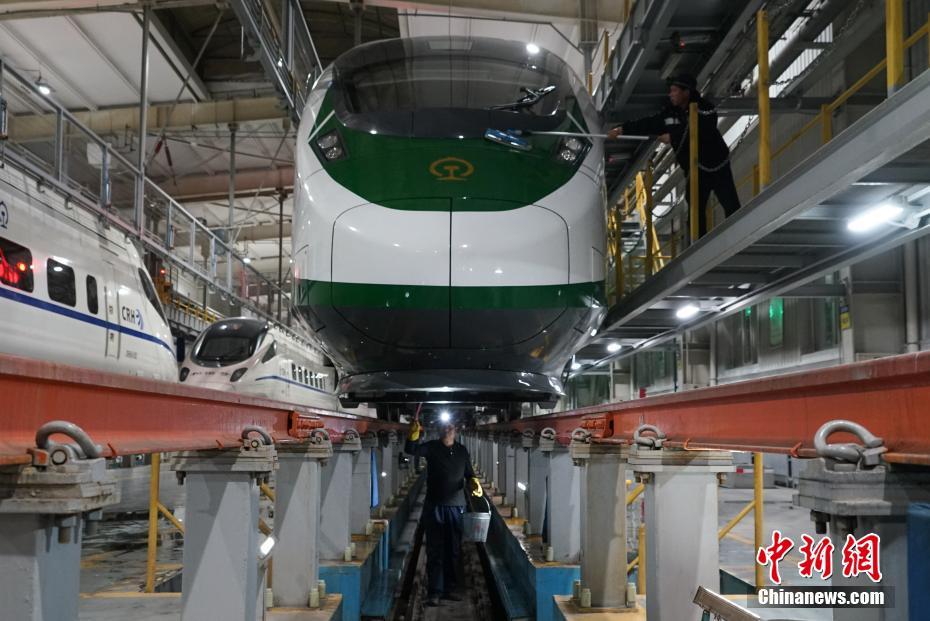 1月30日晚,在青藏鐵路公司西寧車輛段動車運用車間,地勤機械師在無電作業(yè)時進行動車組走行部關(guān)鍵部位的檢修。中新社記者 馬銘言 攝