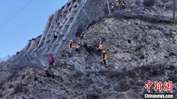 “小心腳底,不要被絆到了,找一個平一點的地方把它碼好,堆好,有條件的挖個坑埋好。”在第一個巡查點,明磊叮囑著同事們。此時,他們腳下的大山海拔3100多米,面向鐵路的山體就像穿了衣服,包裹著一片金屬網(wǎng)。此外,從鐵路線到山頂還設(shè)有4層聳立的被動防護(hù)網(wǎng),14個加固區(qū)巖石表面更是增設(shè)了眾多錨桿框架梁、地錨梁等,以防止山體崩塌。
