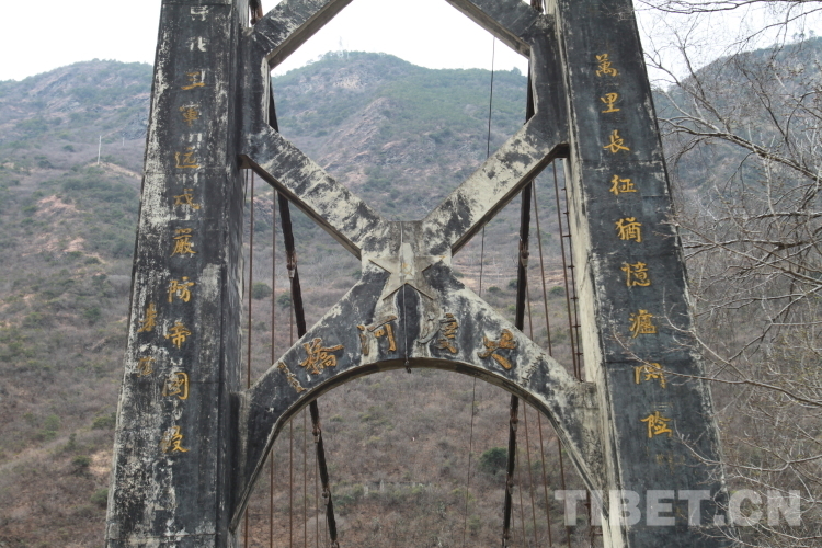 據(jù)了解,大渡河橋東西橋頭塔高分別為16米,孔徑132米,橋面4.5米,由27根直徑約3厘米大小的綱繩分布于左右兩側(cè),中間分別由45根同樣大小的鋼纜吊桿將橋身懸吊在大渡河上,橋身由無數(shù)鋼架鉚焊而成,鋼架之上鋪有約0.5米見方的方橙枕木,上鋪“人”字型拼木,允許載重量15噸。東西橋頭分別建有堅固的崗亭,西橋頭正面豎有三道屏墻,左為原中國人民解放軍第十八軍軍長張國華,政委譚冠三撰寫的碑文,中間書有毛澤東同志七律《長征》詩手跡,右為建橋工程說明。