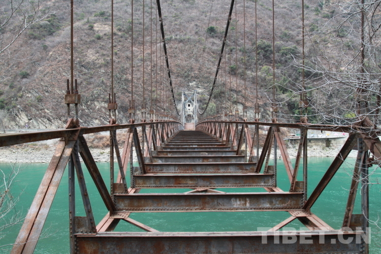 該橋始建于1950年11月。當時為了徹底解放西藏、鞏固西南邊防,中國人民解放軍第十八軍在劉伯承、鄧小平、賀龍等同志“一面進軍,一面建設”的號召下,在修筑川藏公路的同時,由西南交通部負責,廣大解放軍指戰(zhàn)員、全體技術人員和各路民工發(fā)揚不怕犧牲的革命精神,克服一切困難,修建了川藏公路上的第一座鋼索懸橋,于1951年5月底勝利完成了建橋任務。
