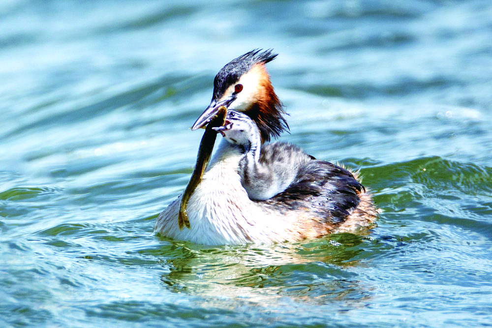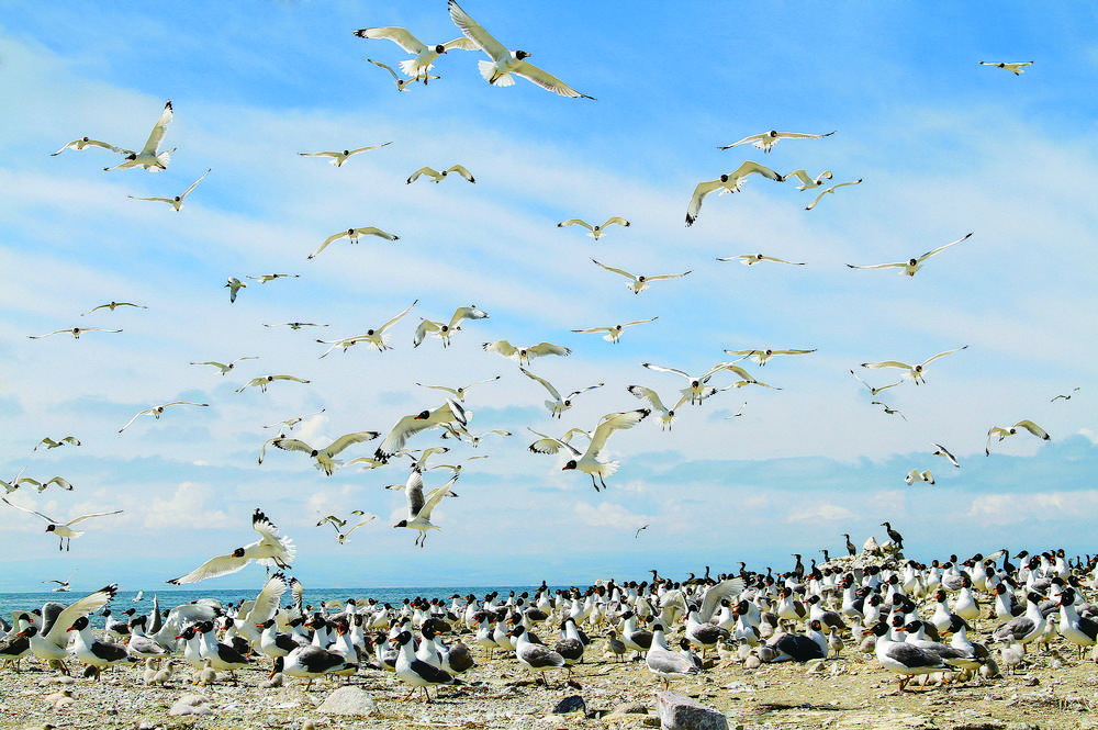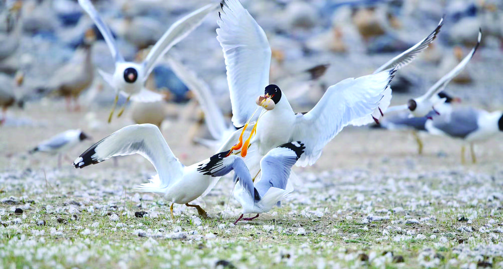 候鳥北歸,青海湖又將進(jìn)入一年中最美麗的時節(jié)。浮想盛夏時節(jié),棕頭鷗、漁鷗、斑頭雁、普通鸕鶿等水鳥,或成群在低空中擺著“隊(duì)形”,或“拖家?guī)Э凇痹谒嫔湘覒蛲嫠#蚝弯в蔚匿音~上演魚鷗“大戰(zhàn)”,碧波蕩漾的青海湖將美得如詩如畫。(本版圖片除署名外,其他均由青海湖景區(qū)保護(hù)利用管理局提供)