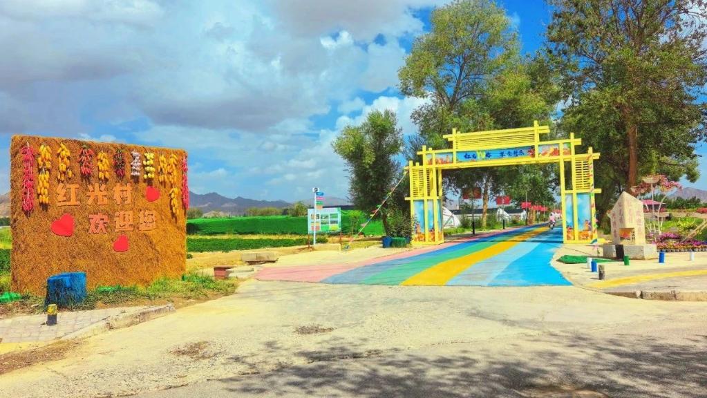 一條繽紛亮眼的“彩虹步道”從村口一直向里延伸,“彩虹步道”兩旁種滿了瓜果蔬菜,不遠(yuǎn)處還有采摘體驗(yàn)園和燒烤露營(yíng)地,在青海省海西蒙古族藏族自治州德令哈市郊的紅光村,別樣的田園風(fēng)情給烈日炎炎下的德令哈增加了一絲清爽。