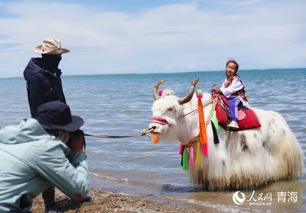 上班時間到,尕瑪本牽著白牦牛來到了青海湖景區(qū)的西湖灘,與其他村民家的二三十頭白牦牛排排站立在湖邊,靜待游客前來觀賞、騎行、拍照。
