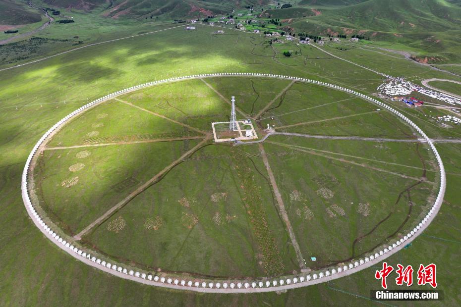 7月22日,四川稻城縣,草原上的圓環(huán)陣太陽射電成像望遠(yuǎn)鏡。(無人機(jī)照片)中新社記者 劉忠俊 攝