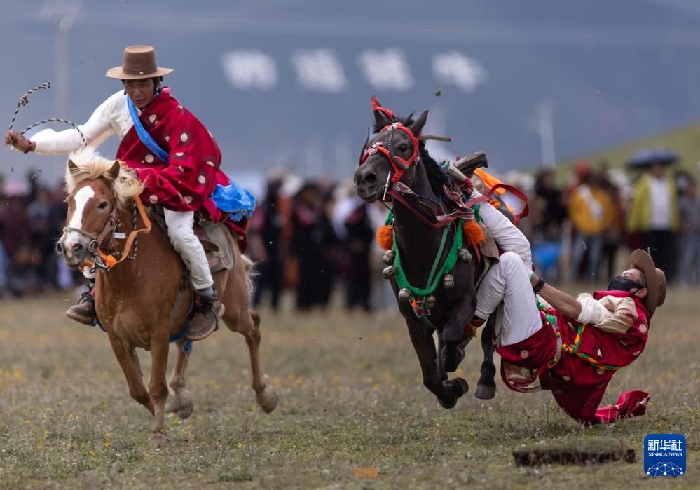 7月30日,在理塘縣多旺塘賽馬場,一名康巴漢子(右)展示馬上射箭。新華社記者 江宏景 攝