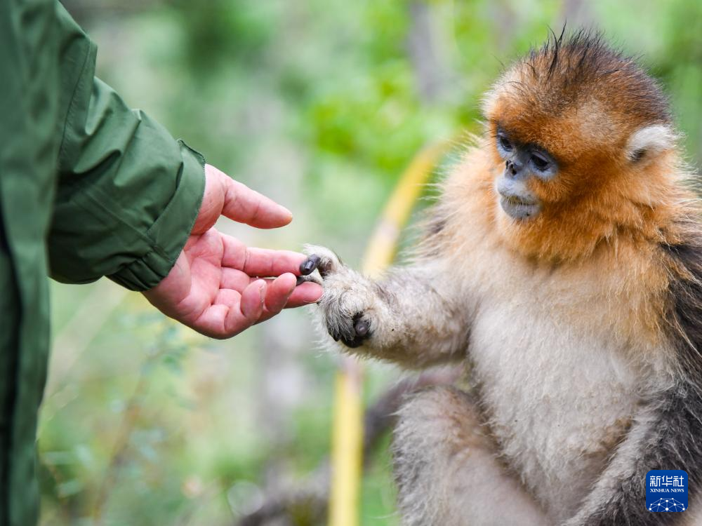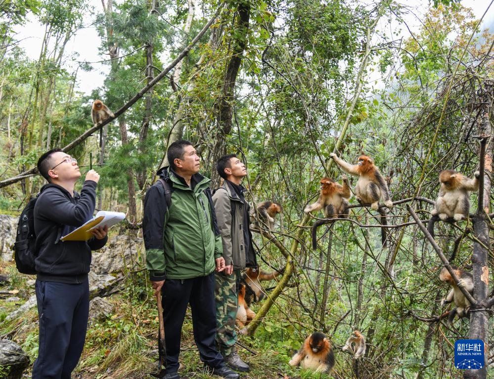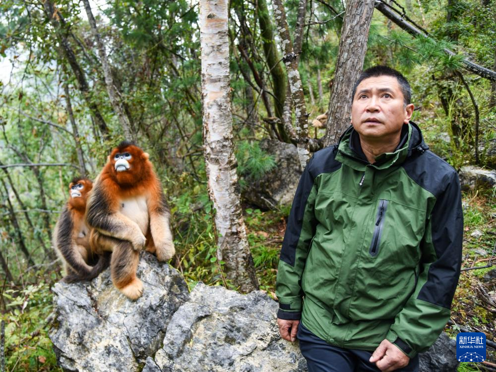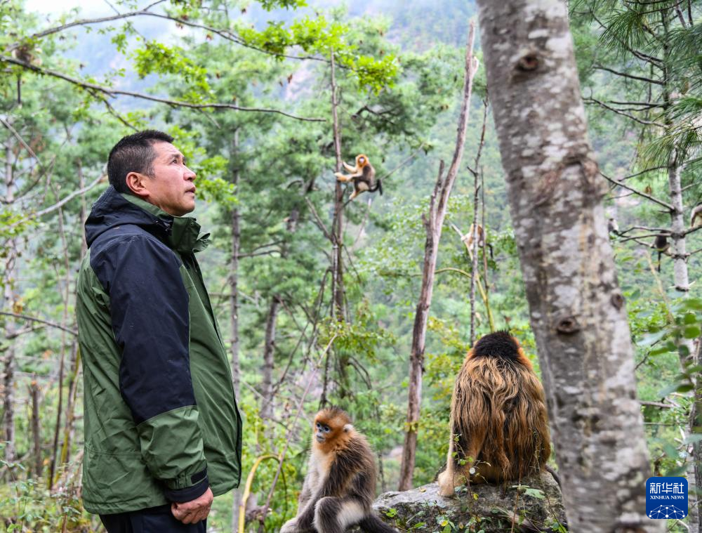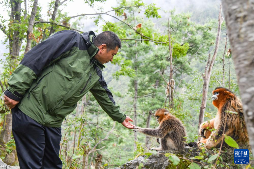 在四川白河國家級自然保護區(qū),唐玉林和川金絲猴互動(10月11日攝)。新華社記者 王曦 攝
