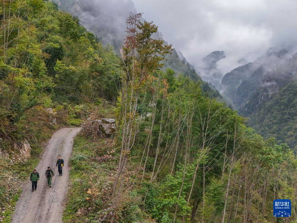 在四川白河國家級自然保護區(qū),唐玉林(左)、侄子唐小剛(中)和西華師范大學生物學研究生劉昕走在巡護的路上(10月11日攝)。新華社記者 王曦 攝