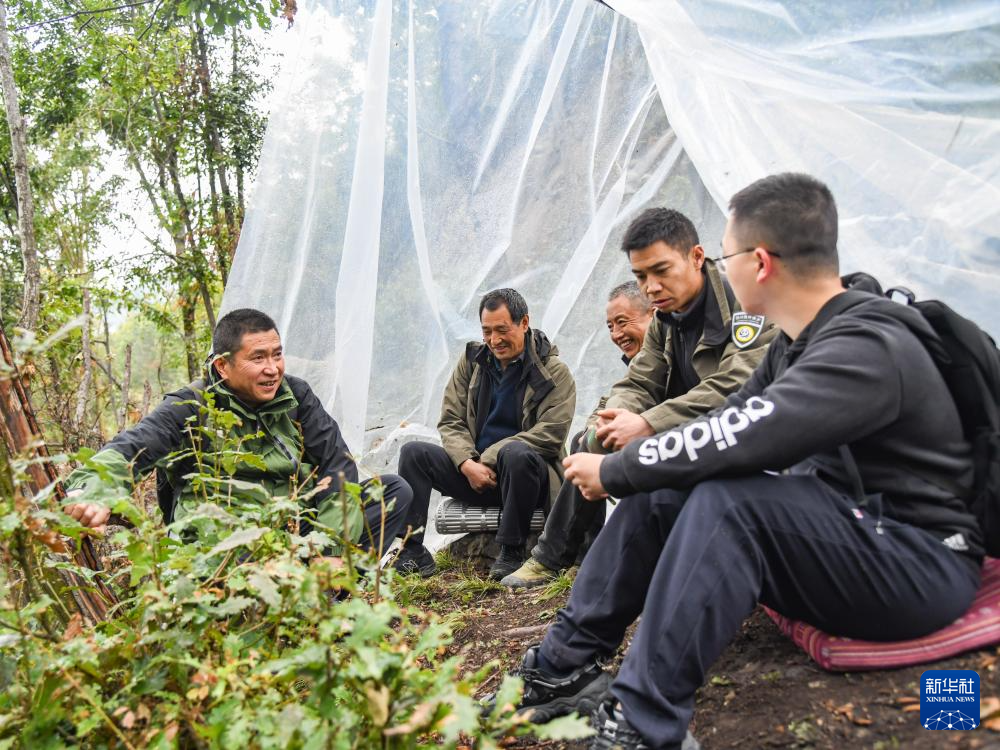 在四川白河國家級自然保護區(qū),唐玉林(左一)和巡護隊員一起在搭建的簡易塑料蓬內(nèi)短暫休息交流(10月11日攝)。新華社記者 王曦 攝