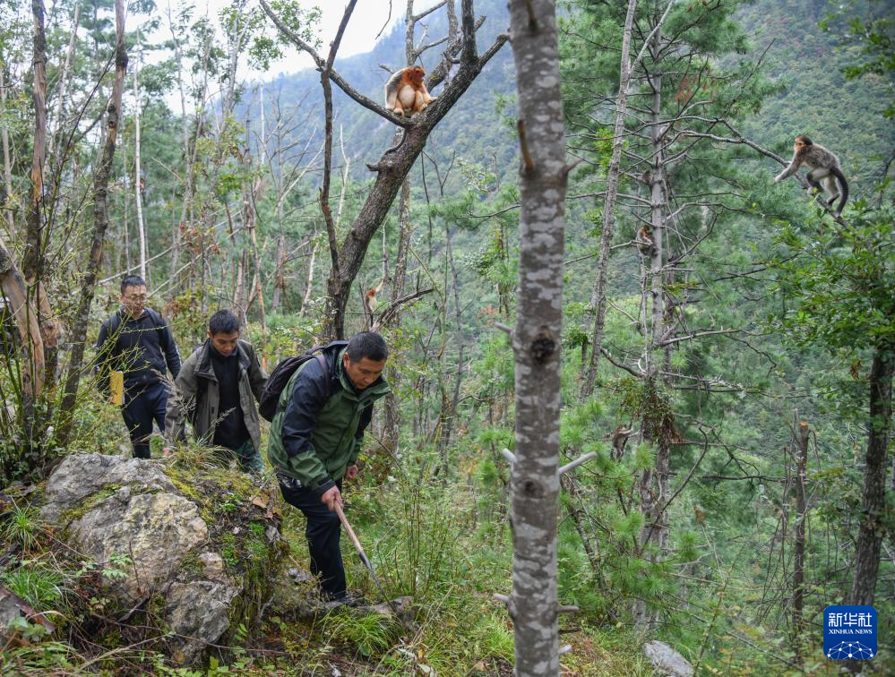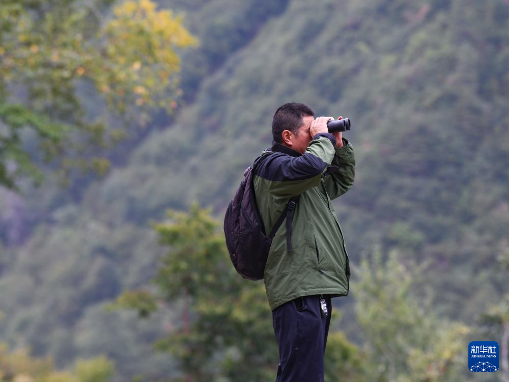 在四川白河國家級自然保護區(qū),唐玉林在觀察川金絲猴活動(10月11日攝)。新華社記者 王曦 攝