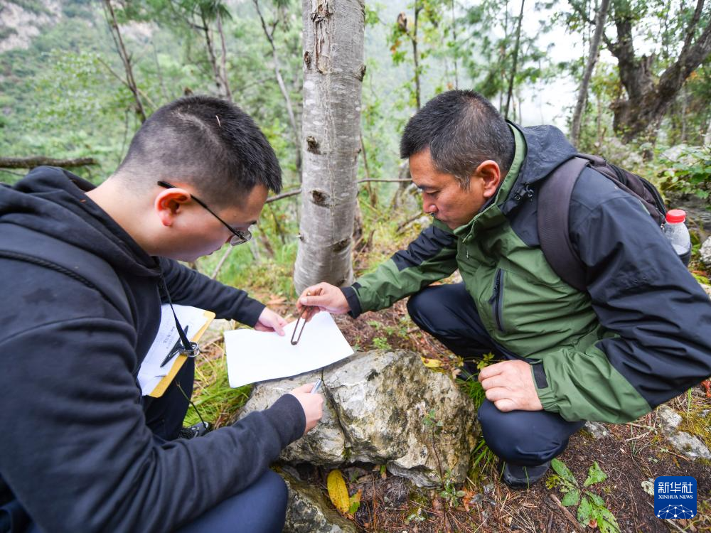 在四川白河國家級自然保護區(qū),唐玉林(右)和西華師范大學生物學研究生劉昕在收集記錄川金絲猴的糞便(10月11日攝)。新華社記者 王曦 攝
