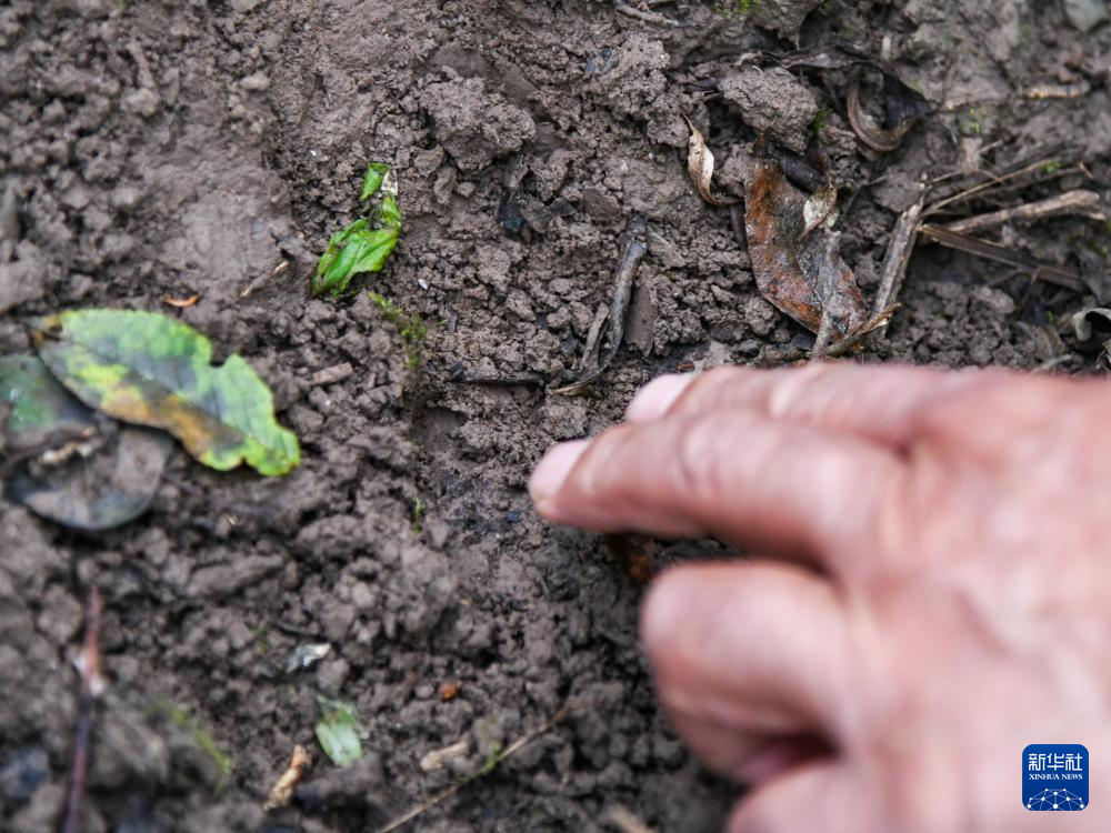 在四川白河國家級自然保護區(qū),唐玉林在巡護路上發(fā)現(xiàn)毛冠鹿的腳?。?0月11日攝)。新華社記者 王曦 攝
