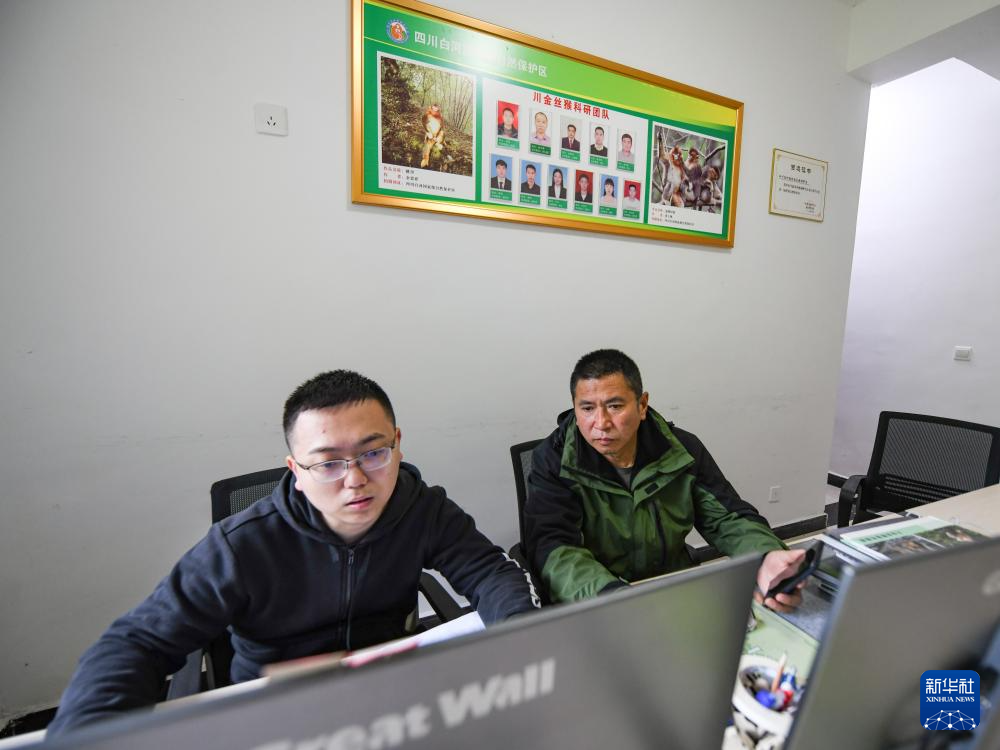 在四川白河國家級自然保護區(qū),唐玉林和西華師范大學生物學研究生劉昕在辦公室將巡護記錄的資料錄入電腦系統(tǒng)(10月11日攝)。新華社記者 王曦 攝