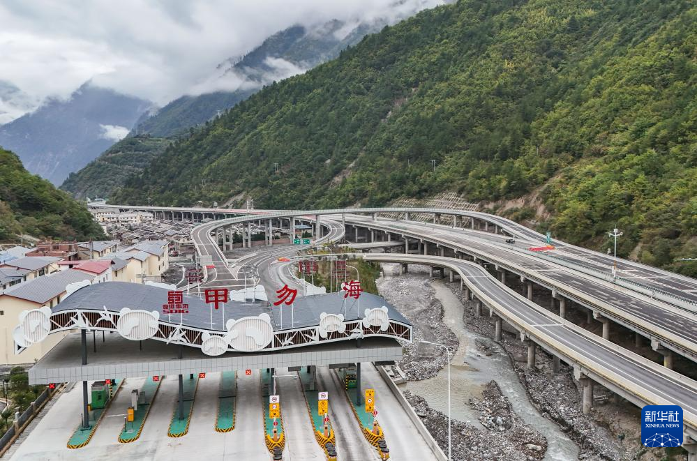 這是10月11日拍攝的正在建設(shè)中的九寨溝—綿陽高速公路甲勿海收費(fèi)站(無人機(jī)照片)。九綿高速開通后,從成都至九寨溝縣的時(shí)間將從原來的8小時(shí)縮短至4小時(shí)。新華社記者 王曦 攝