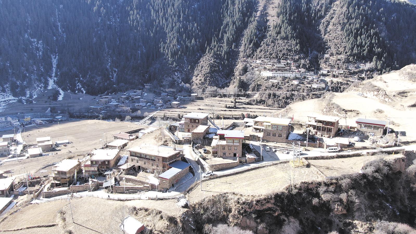 1月13日,記者從班瑪縣出發(fā),沿著蜿蜒的瑪珂河一路南下,來(lái)到了“中國(guó)保存最完好的藏式碉樓群落之一”的班瑪縣燈塔鄉(xiāng)班前村。走進(jìn)班前村,只見(jiàn)四面群山環(huán)繞,不遠(yuǎn)處,結(jié)著冰的瑪珂河像一條白絲帶,在陽(yáng)光的照耀下格外耀眼。依山傍水的班前村地勢(shì)起伏較大,行走其間多半為上坡路,不一會(huì)兒,記者來(lái)到一處相對(duì)平坦的房屋前,上面掛著的匾額上赫然寫(xiě)著“中國(guó)傳統(tǒng)村落——班前村”。
